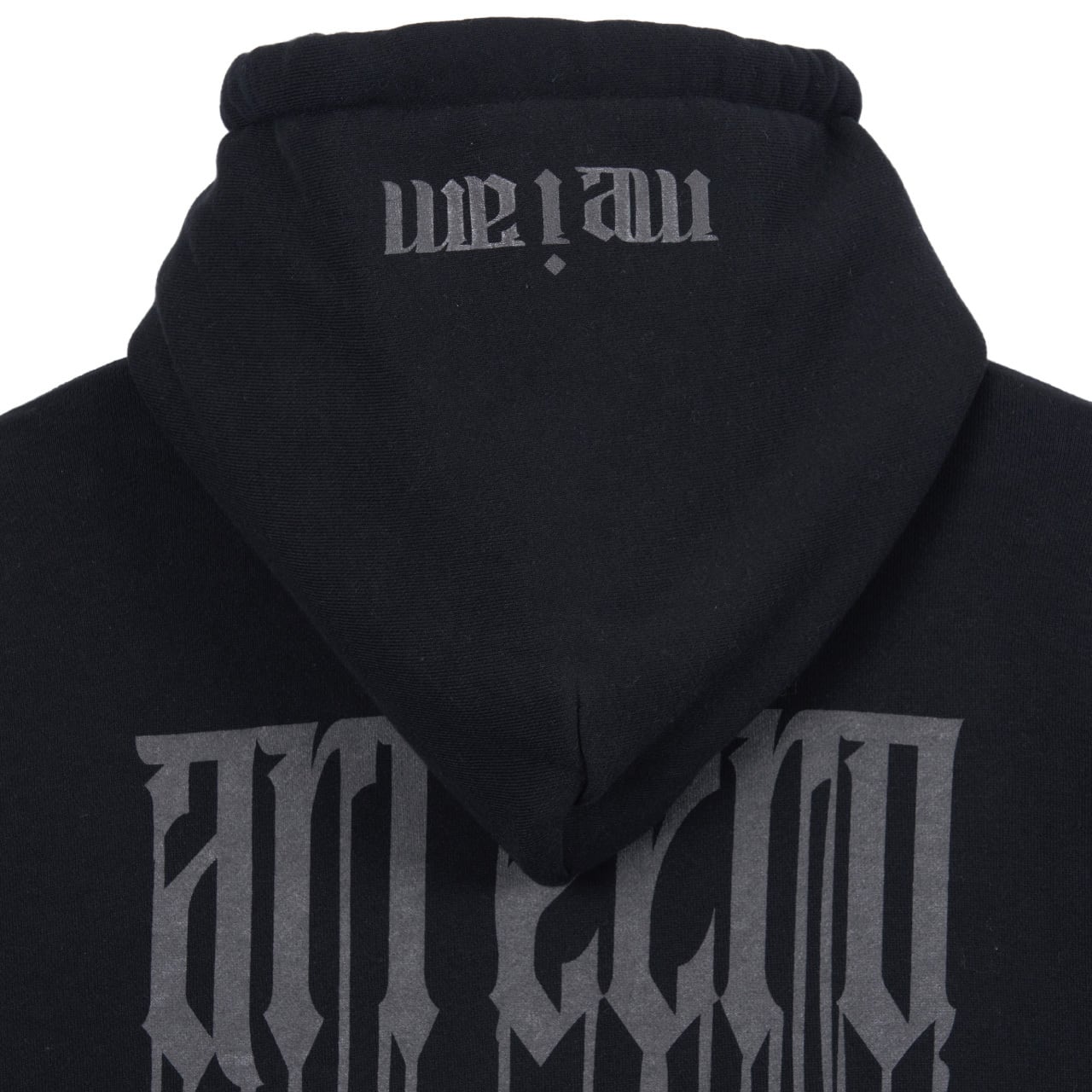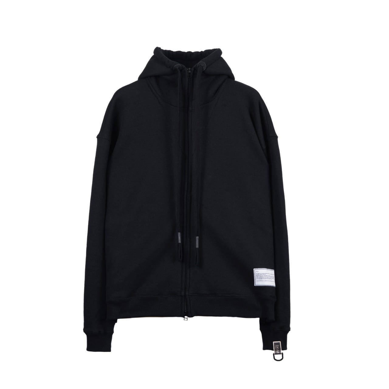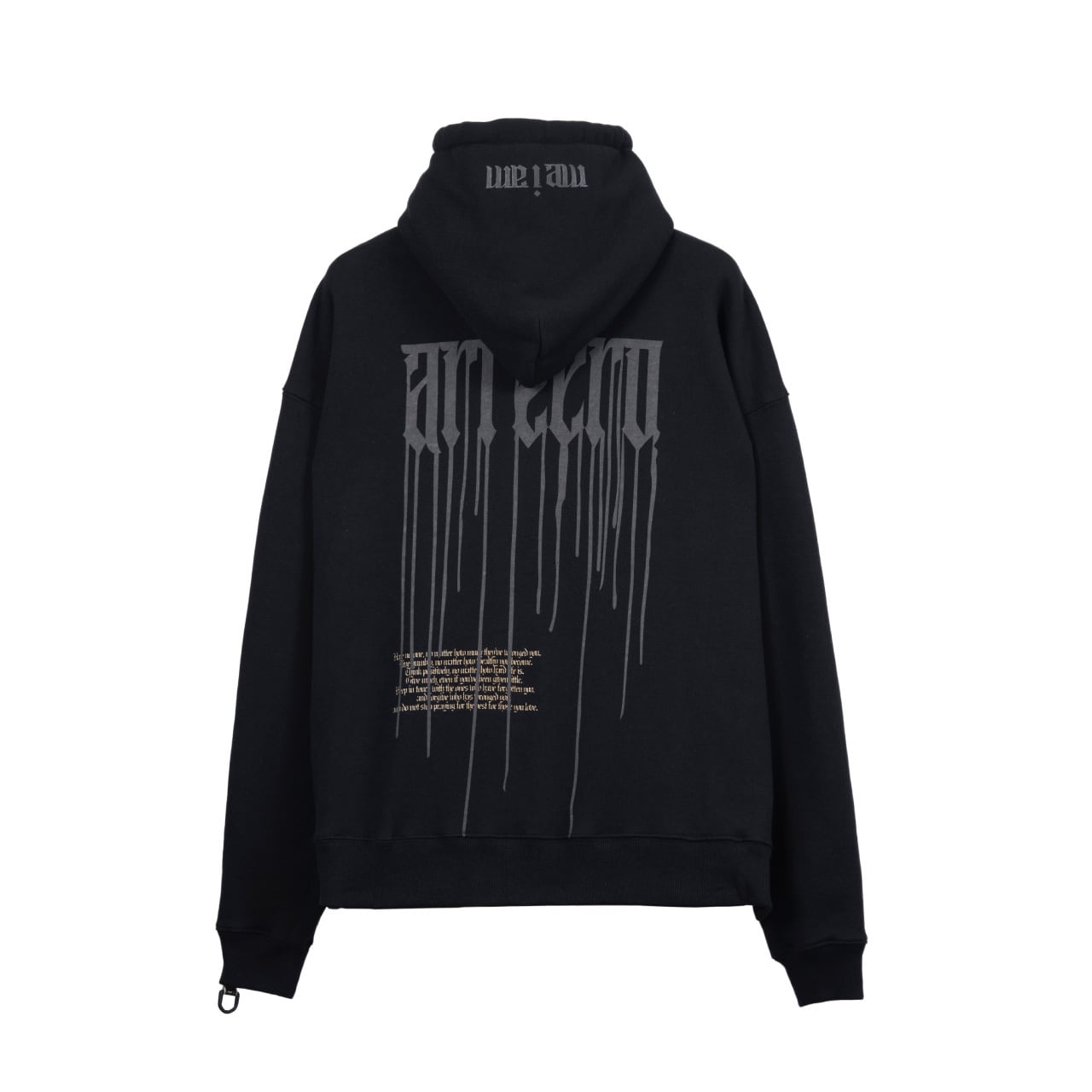 風合い豊かなコットン裏毛を使用したジップアップフーデッド。身頃の両脇にスラッシュポケット、フード口にロングスピンドルを配置、シルエット調整が可能な仕様。背面中央にシーズンテーマ“ART ZERO”のグラフィック、フード先端にme I amのレターグラフィックをラバープリント。身頃の左下にスクウェアネームを叩きつけ、左袖に織りネームとD環を挟み込んだオリジナルディテール。身幅にゆとりのあるシルエット