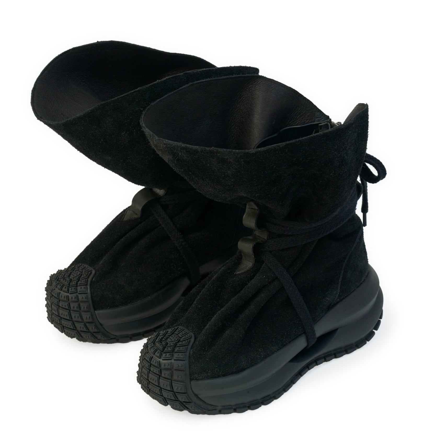 Sack boots inspired by 90s collections, designed to look like you slipped your feet into a bag and wrapped shoelaces around them.