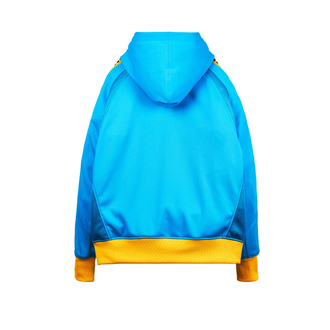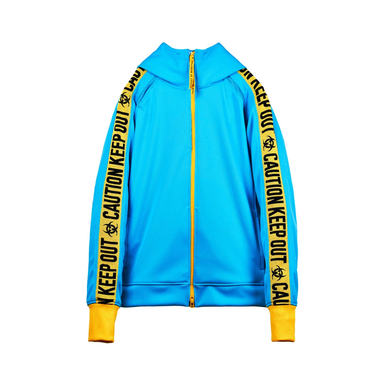 “CAUTION KEEP OUT”のジャガード編みのテープが付属したポリエステル素材のトラックジャケット。ジップアップ仕様のフーデッドデザイン。袖・裾に長めのリブ、両脇下にスラッシュポケットを配置。ジップスライダーにメッセージプリントのリボンテープが付属。ターコイズ、ブラックの2色展開。