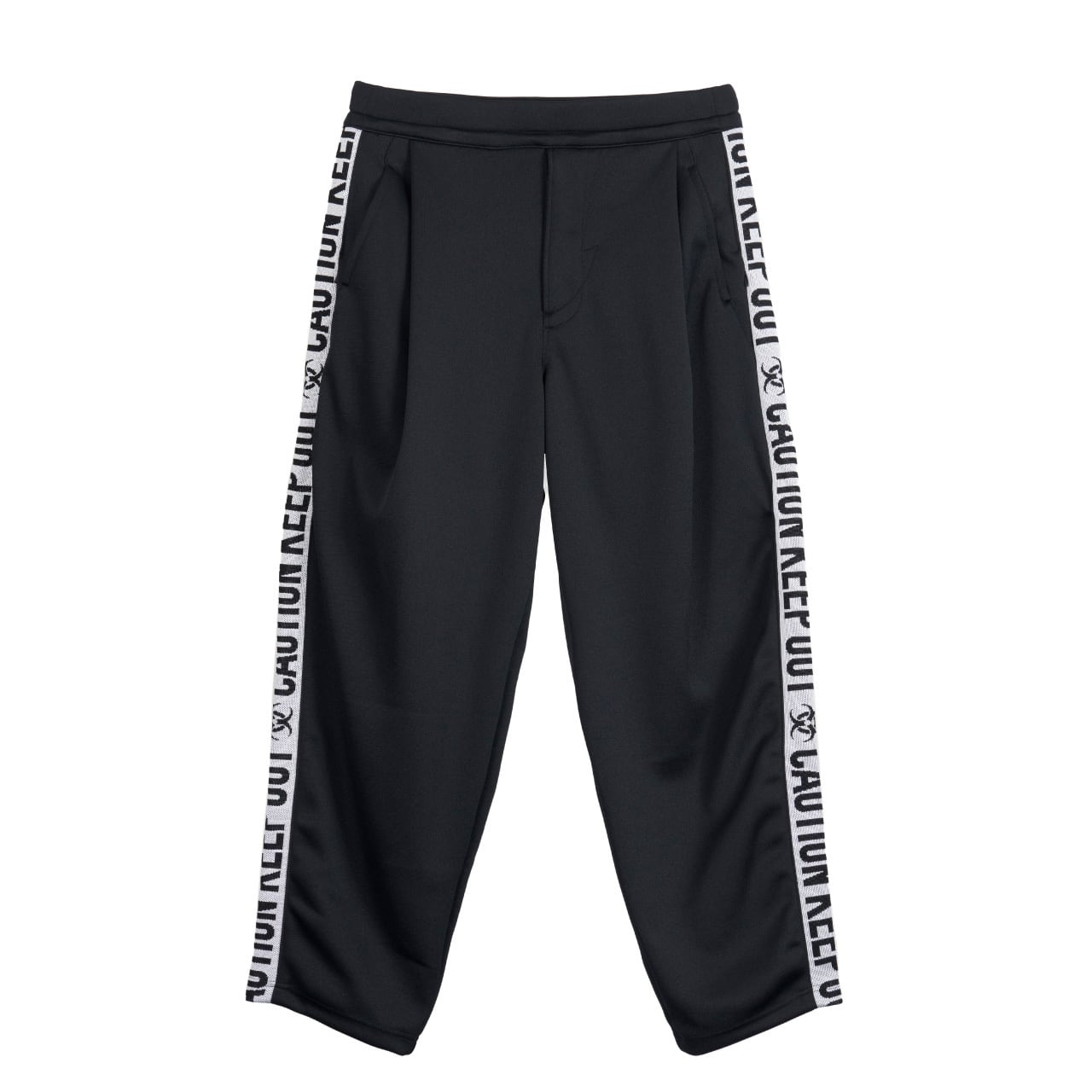 ポリエステル素材を使用した“ボンタン型”トラックパンツ。従来のデザインをパターンから再構築を行い、ヒップ、レッグなどの各所を大幅にシルエットチェンジ。身頃の前後両脇にスラッシュポケット、右腿にコンシールファスナーポケットを配置。両足にジャガードで表現したCAUTION KEEP OUTのテープを配したデザイン。ウエスト、腿周りにゆとりのあるテーパードシルエット。