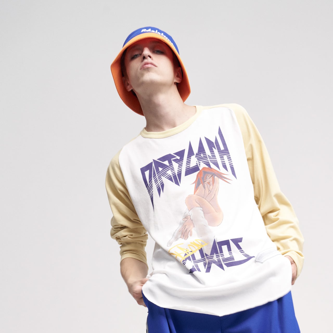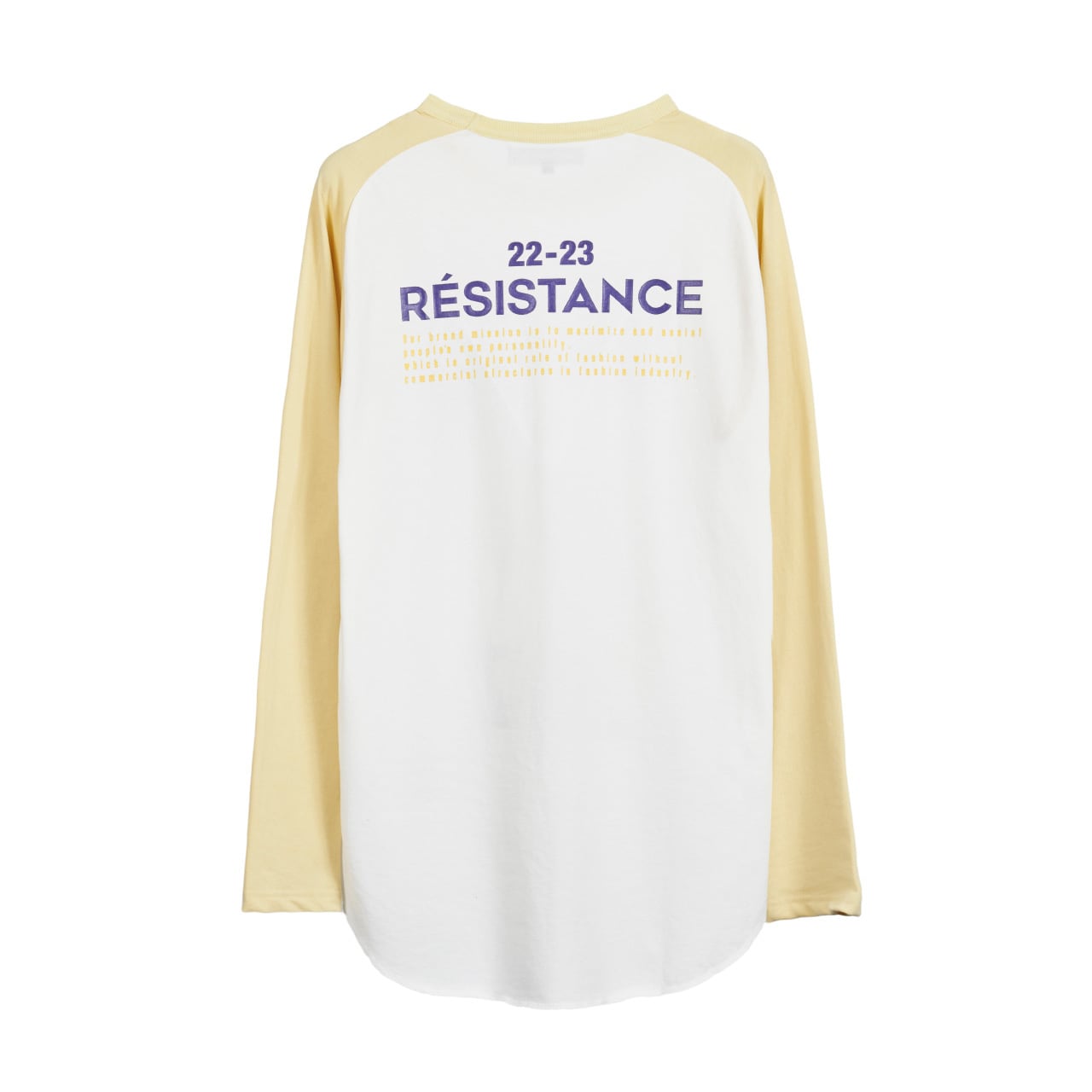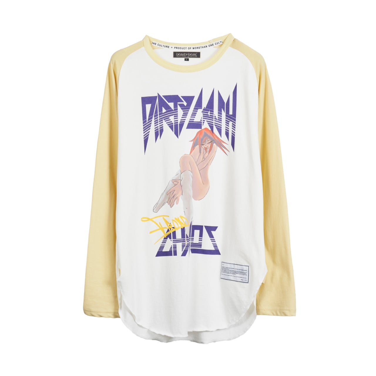 オリジナルで作成したコットン天竺素材を使用したラグランスリーブTシャツ。前身頃にアーカイブのアニメ画風グラフィックをインクジェットプリント、背面にシーズンコンセプトをラバープリントしたデザイン。ラグランスリーブで身幅にゆとりのあるシルエット。2色3サイズ展開。