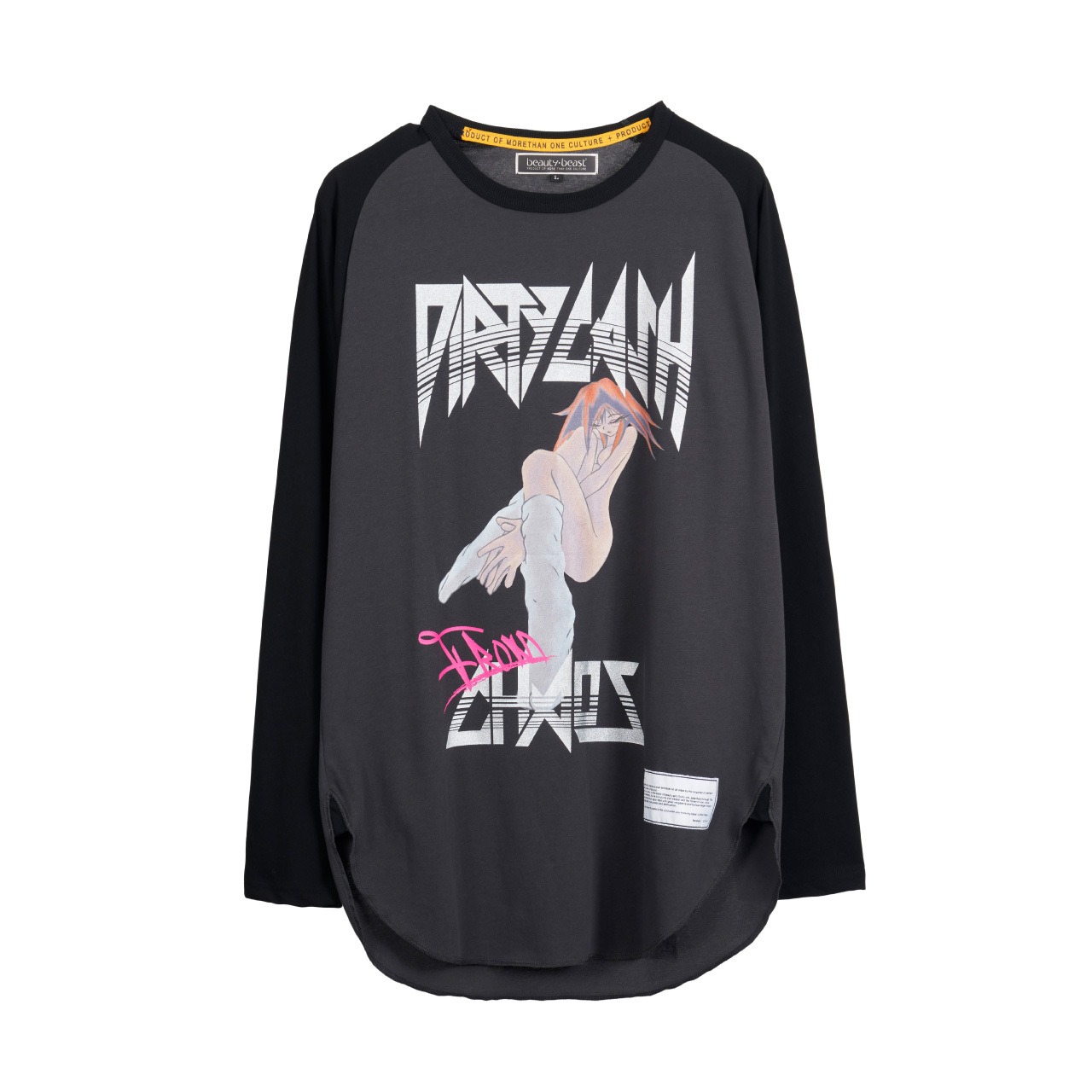 オリジナルで作成したコットン天竺素材を使用したラグランスリーブTシャツ。前身頃にアーカイブのアニメ画風グラフィックをインクジェットプリント、背面にシーズンコンセプトをラバープリントしたデザイン。ラグランスリーブで身幅にゆとりのあるシルエット。2色3サイズ展開。