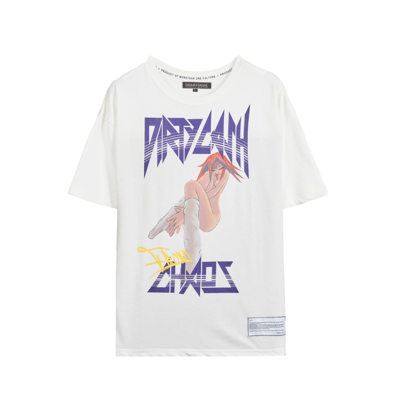 オリジナルで作成したコットン天竺素材を使用したショートスリーブTシャツ。前身頃にアーカイブのアニメ画風グラフィックをインクジェットプリント、背面にシーズンコンセプトをラバープリントしたデザイン。身幅にゆとりのあるシルエット。2色3サイズ展開。