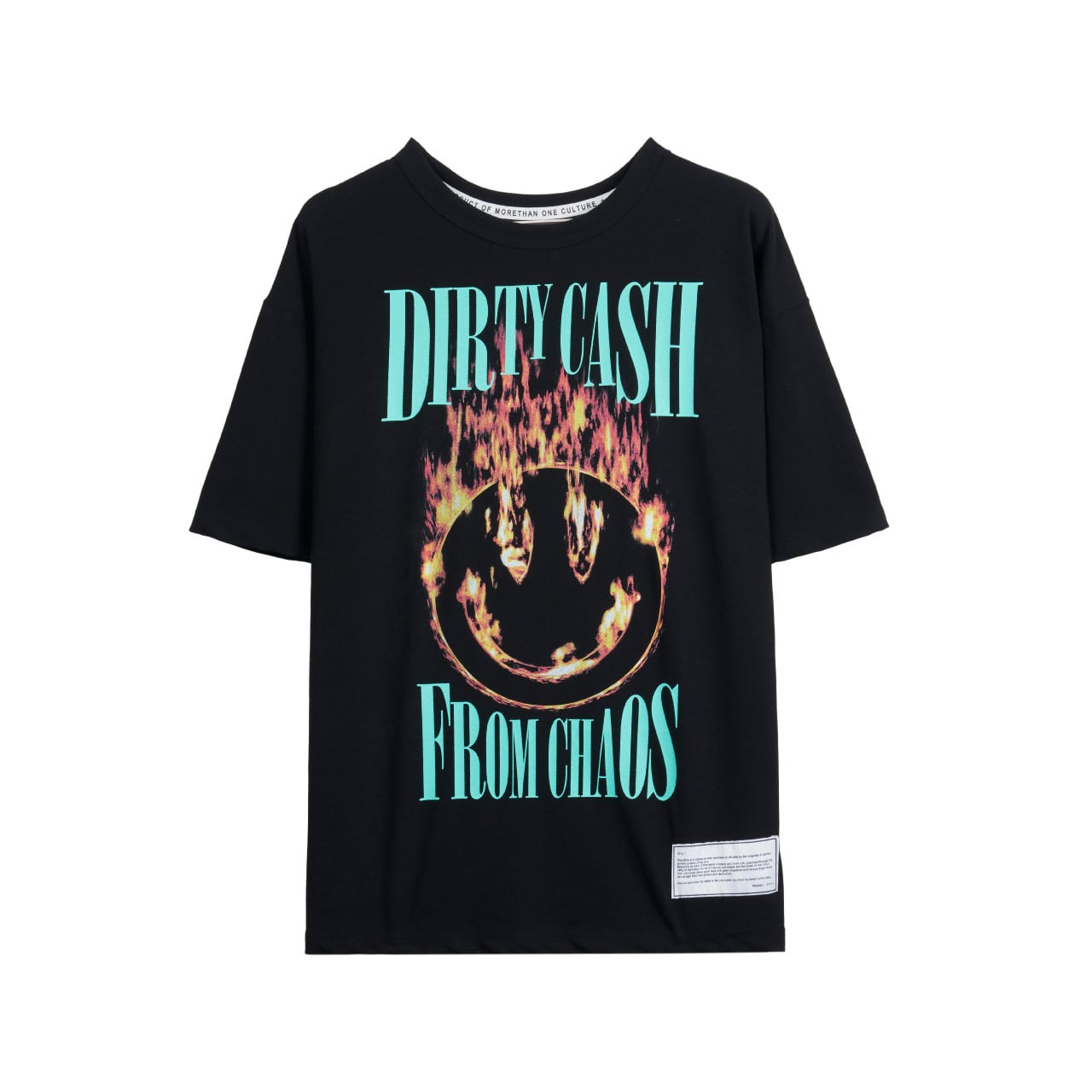 オリジナルで作成したコットン天竺素材を使用したショートスリーブTシャツ。前身頃にフレイム柄スマイルをインクジェットプリント、背面にシーズンコンセプトをラバープリントしたデザイン。身幅にゆとりのあるシルエット。2色3サイズ展開。