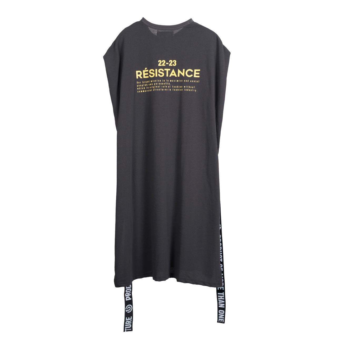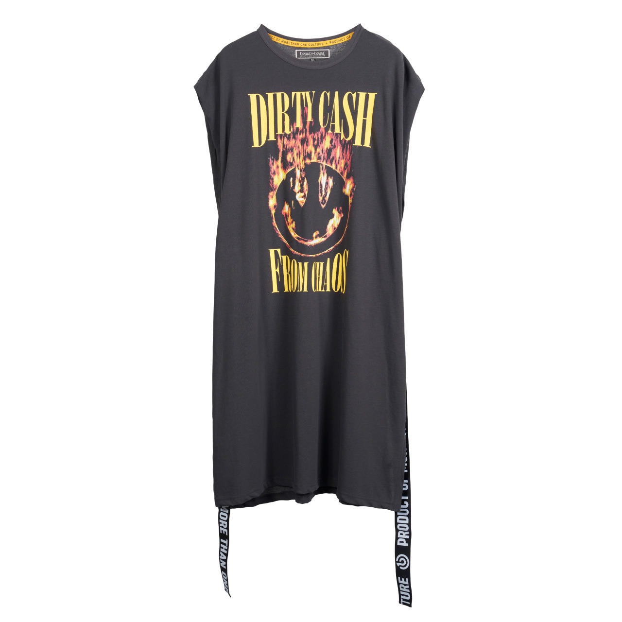 Chazzle T-shirt made of originally created cotton jersey material. Inkjet-printed flame smile on the front, rubberized print of the season's concept on the back, and printed tape attached to both sides of the waist. Long silhouette with roomy body and armholes; available in two colors and three sizes.