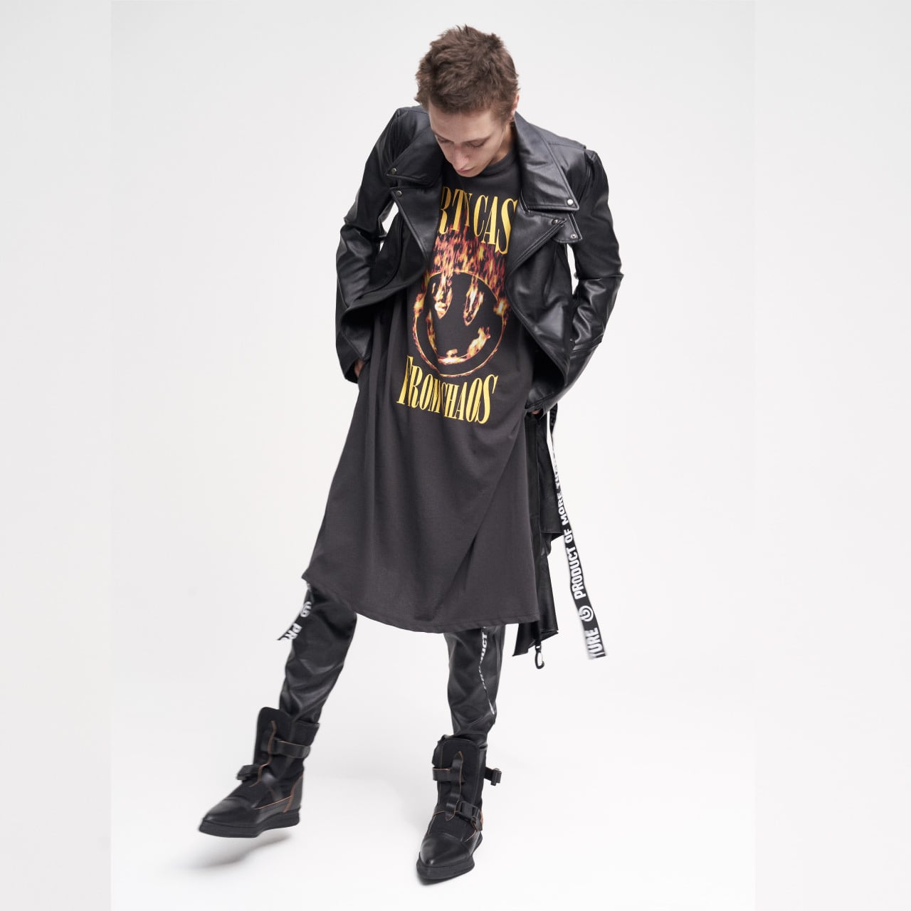 オリジナルで作成したコットン天竺素材を使用したチャズブルTシャツ。前身頃にフレイム柄スマイルをインクジェットプリント、背面にシーズンコンセプトをラバーププリント、ウエスト両脇にプリントテープが付属するデザイン。身幅、アームホールにゆとりのある着丈の長いシルエット。2色3サイズ展開。