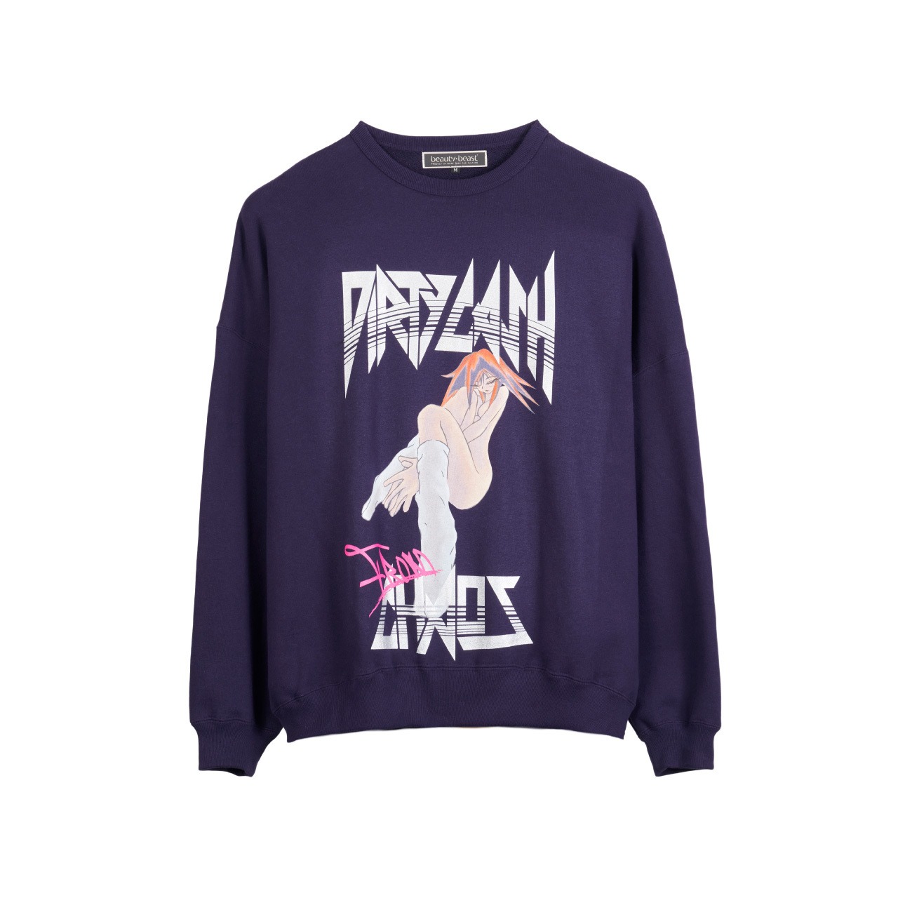 風合いの良いコットン裏毛素材を使用したクルーネックスウェットシャツ。前身頃にアーカイブのアニメ画風グラフィックをインクジェットプリント、背面にシーズンコンセプトをラバープリントしたデザイン。身幅、アームホールにゆとりのあるシルエット。2色3サイズ展開。