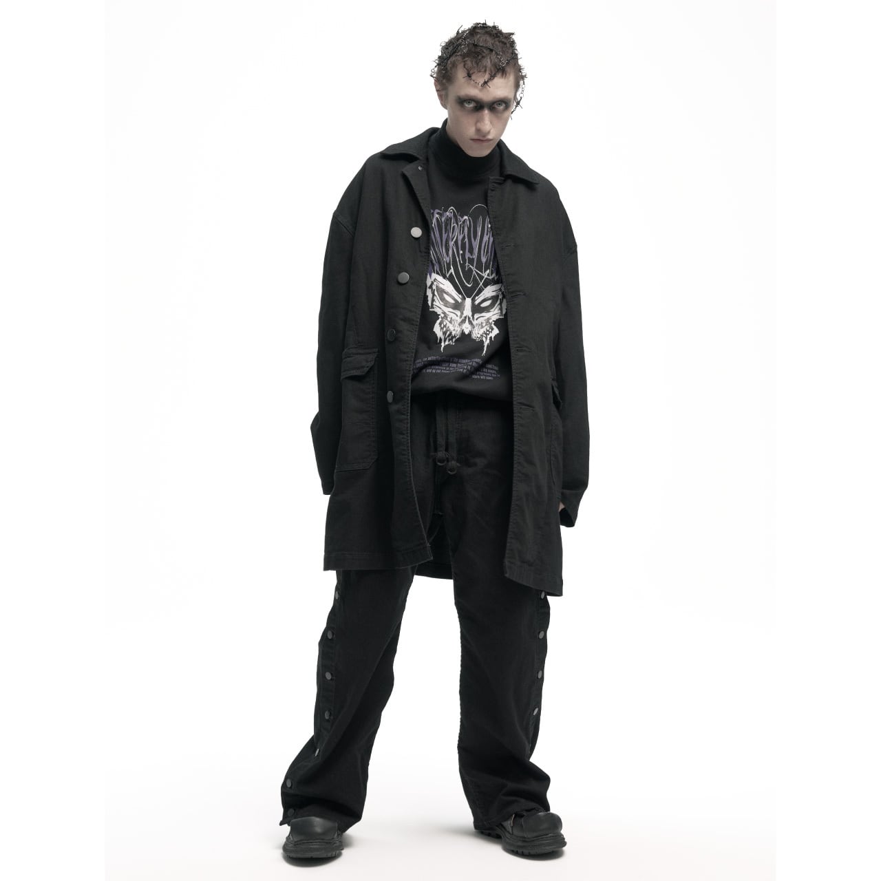コットン100%の素材を使用したデニムエンジニアコート。全てのステッチワークは“エンゼルキング”という特殊な光沢感のあるステッチ糸を使用。90年代から続くbeauty:beastの デニムの特徴を継承した意匠。両腰にフラップ付きポケットを配置。着丈が長め、身幅にゆとりのあるシルエット。