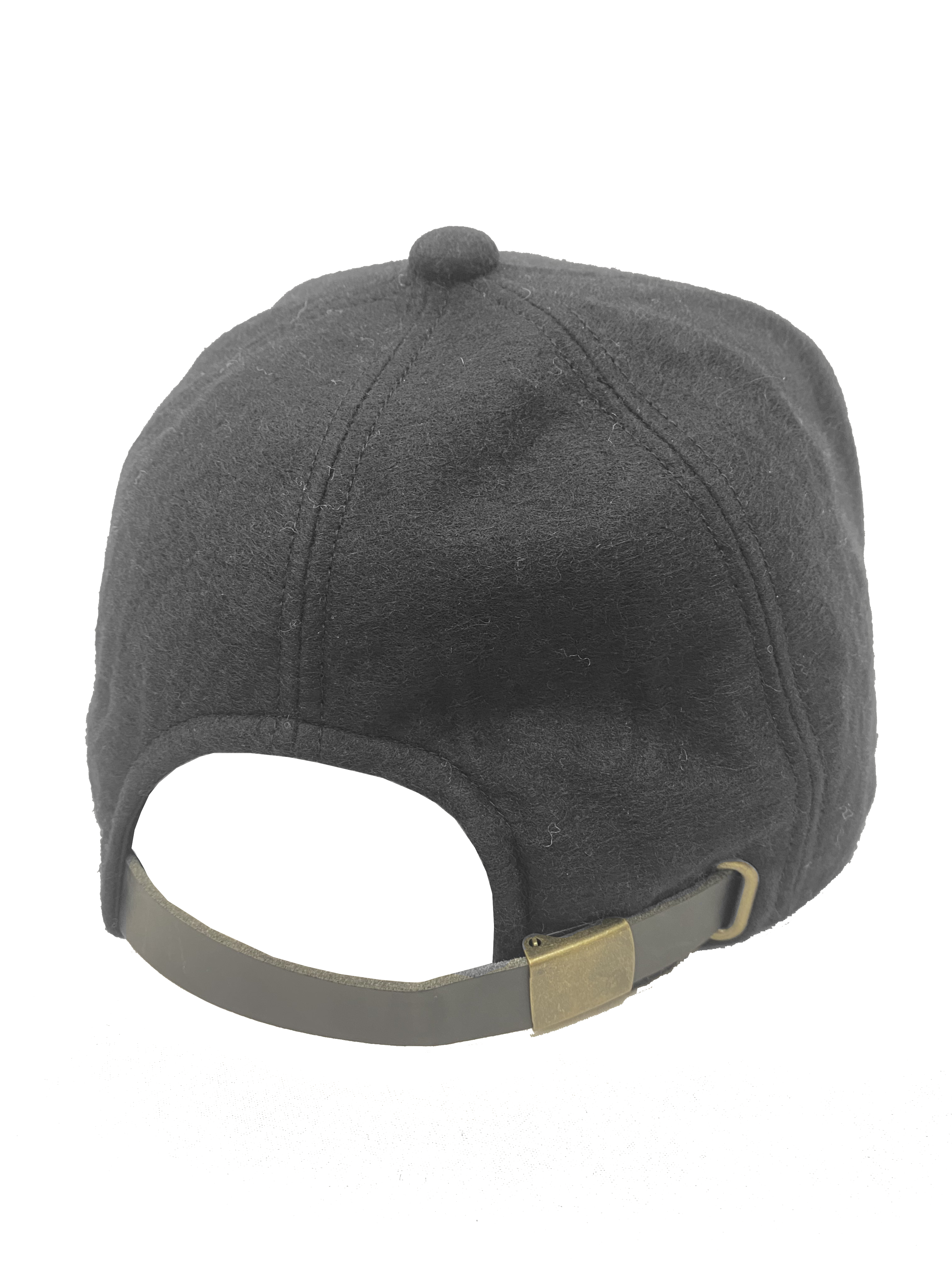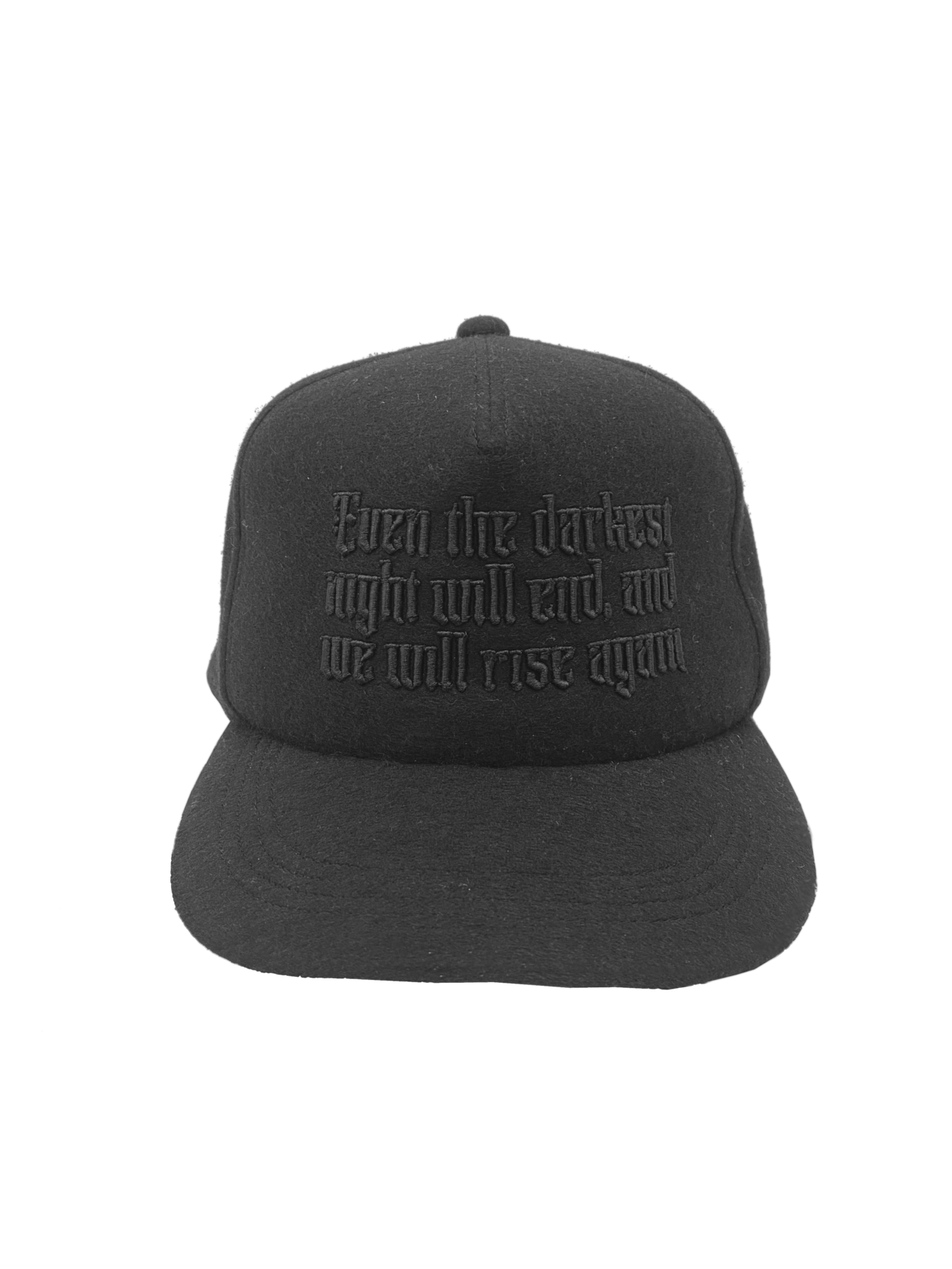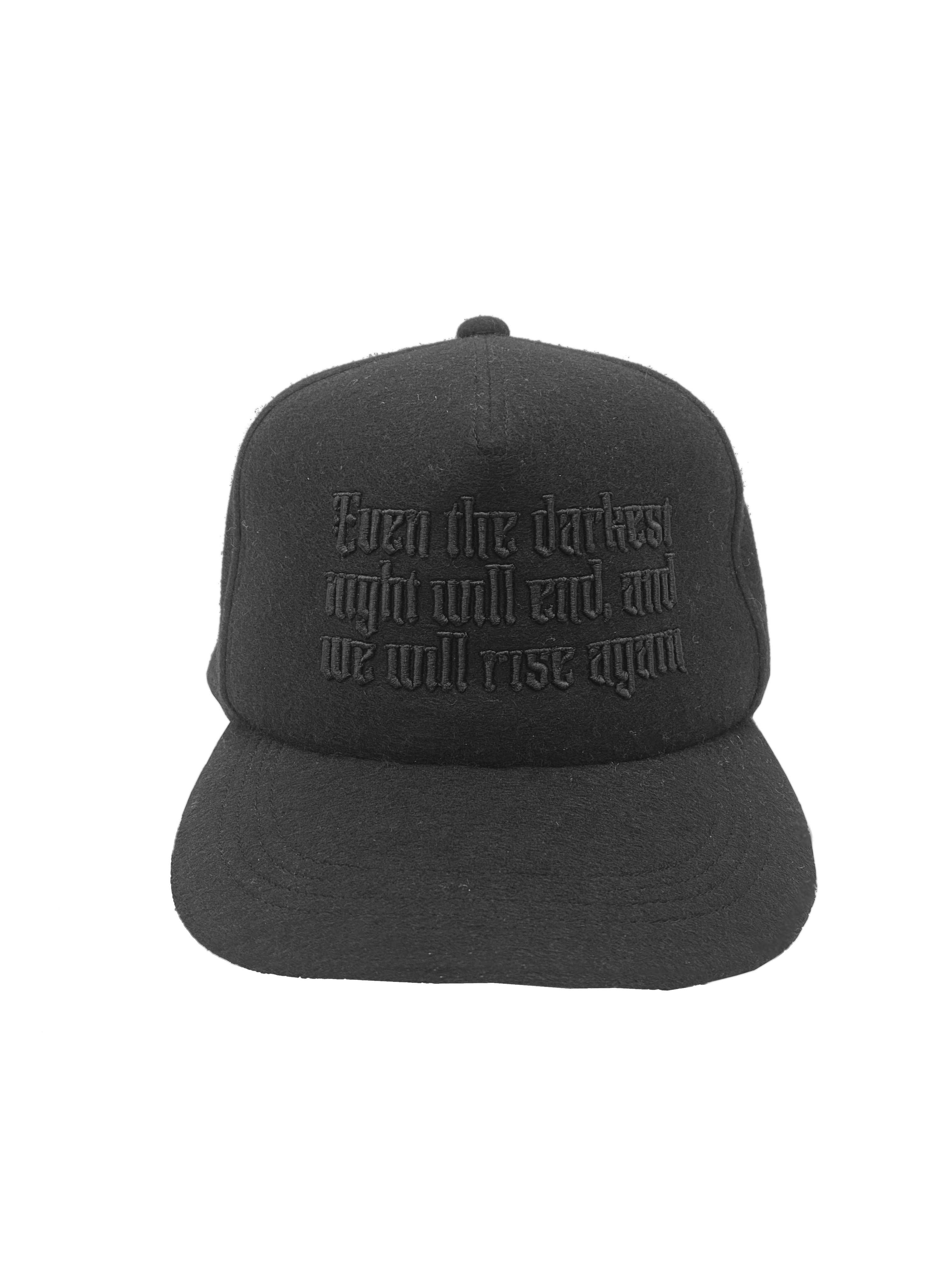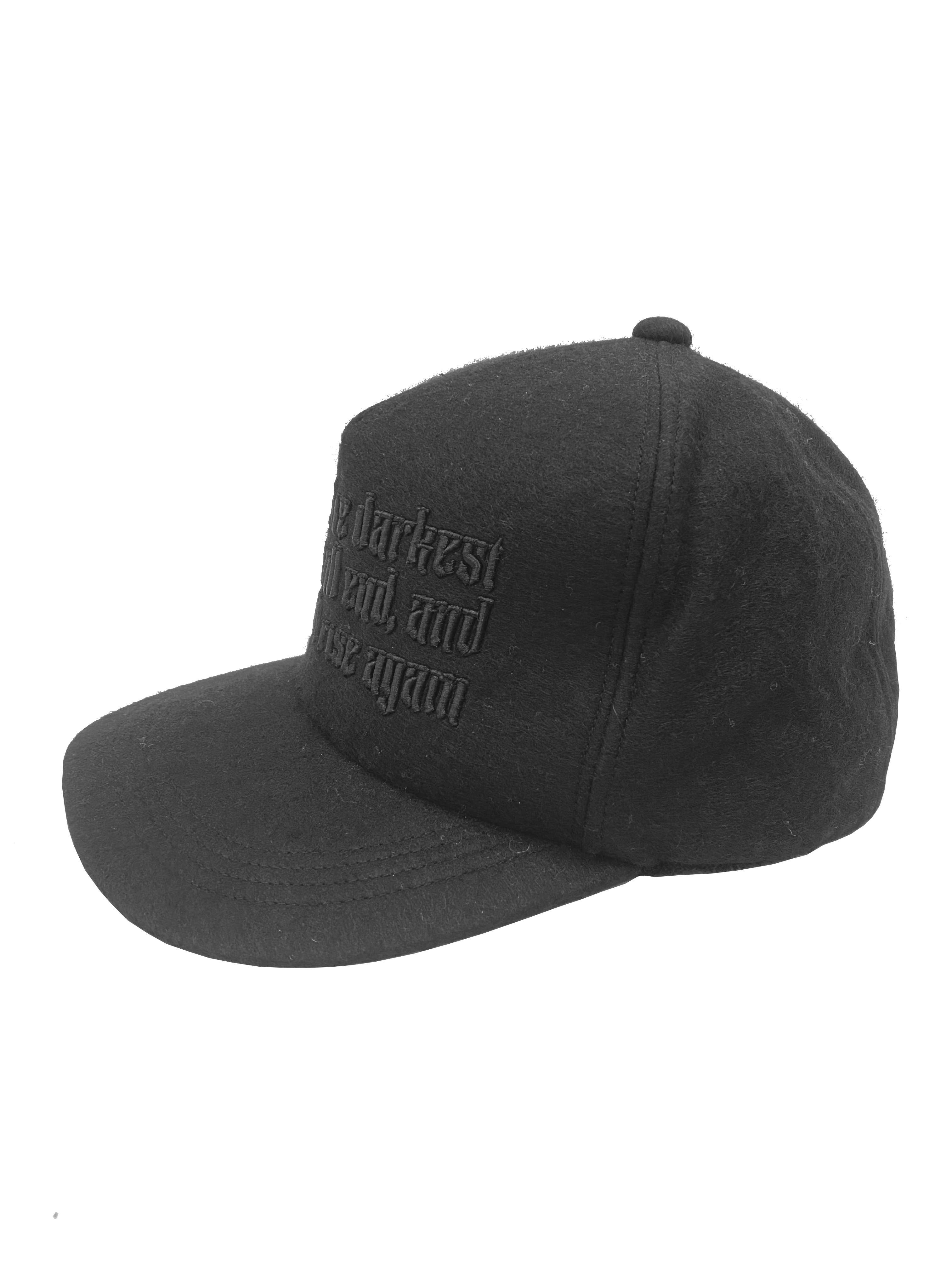 Trucker cap in wool/rayon felt blend. Embroidered seasonal message lettering on front panel. Adjustable back panel.
