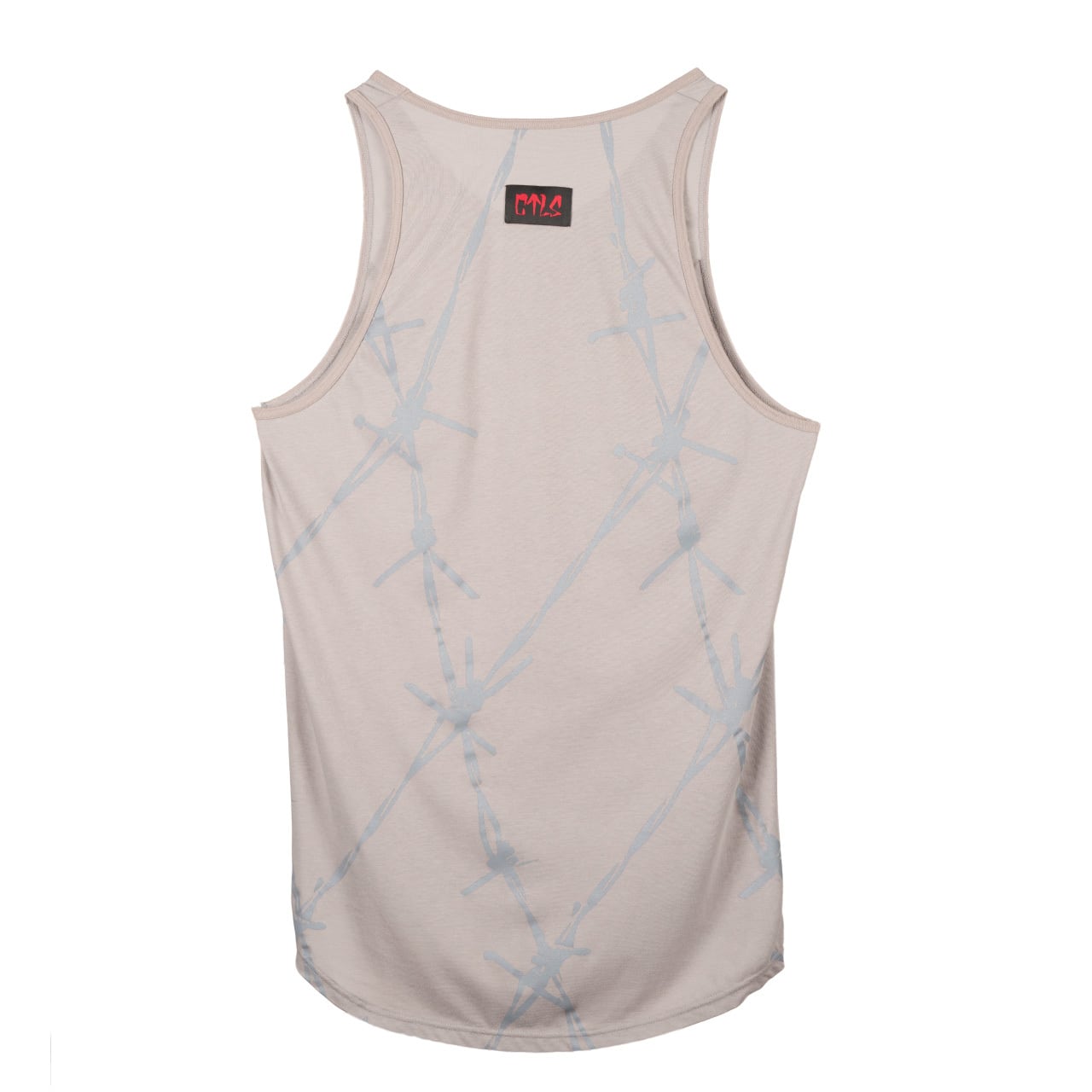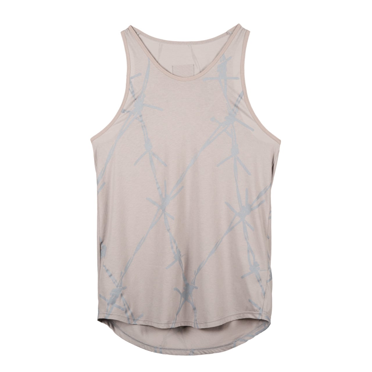 Long tank top with dry touch, originally created by CVTVLIST. The front and back of the body are printed with a graphic pattern of barbed wire used in the Paris collection of beautybeast in 1994.