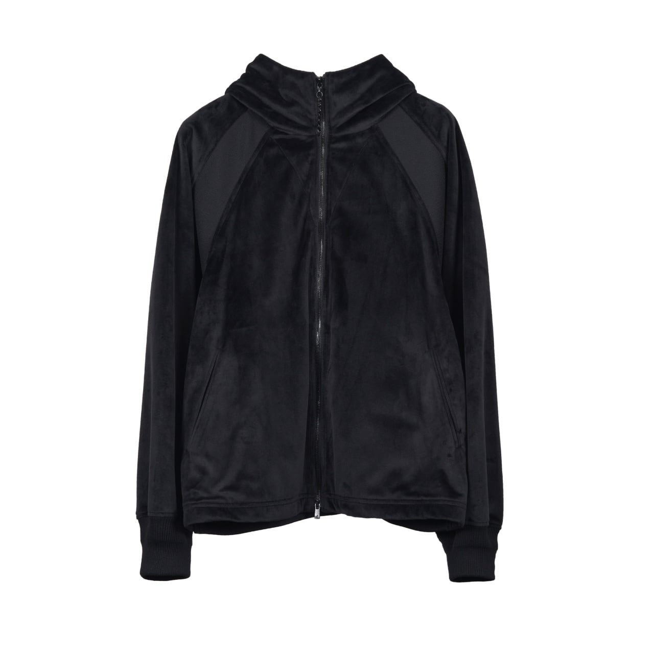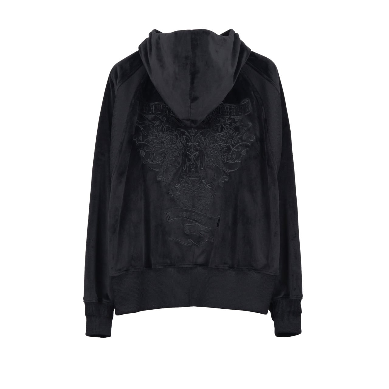 ポリエステルのベロア素材を使用したジップアップフーデッドジャケット。フロント両脇にスラッシュポケットを配置、バックにゴシック調グラフィックを直刺繍で表現したデザイン。