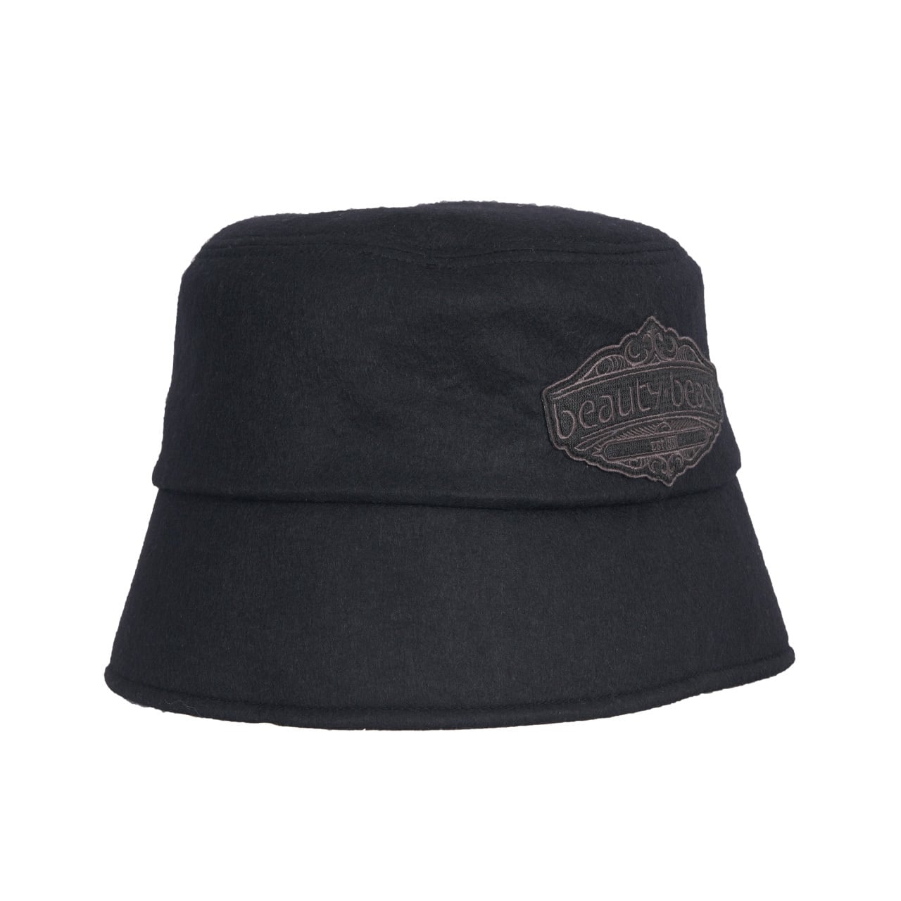 ウール/レーヨン混紡メルトン素材を使用したバケットハット。左側面にエンブレム風に仕上げた刺繍ワッペンを叩きつけたデザイン。